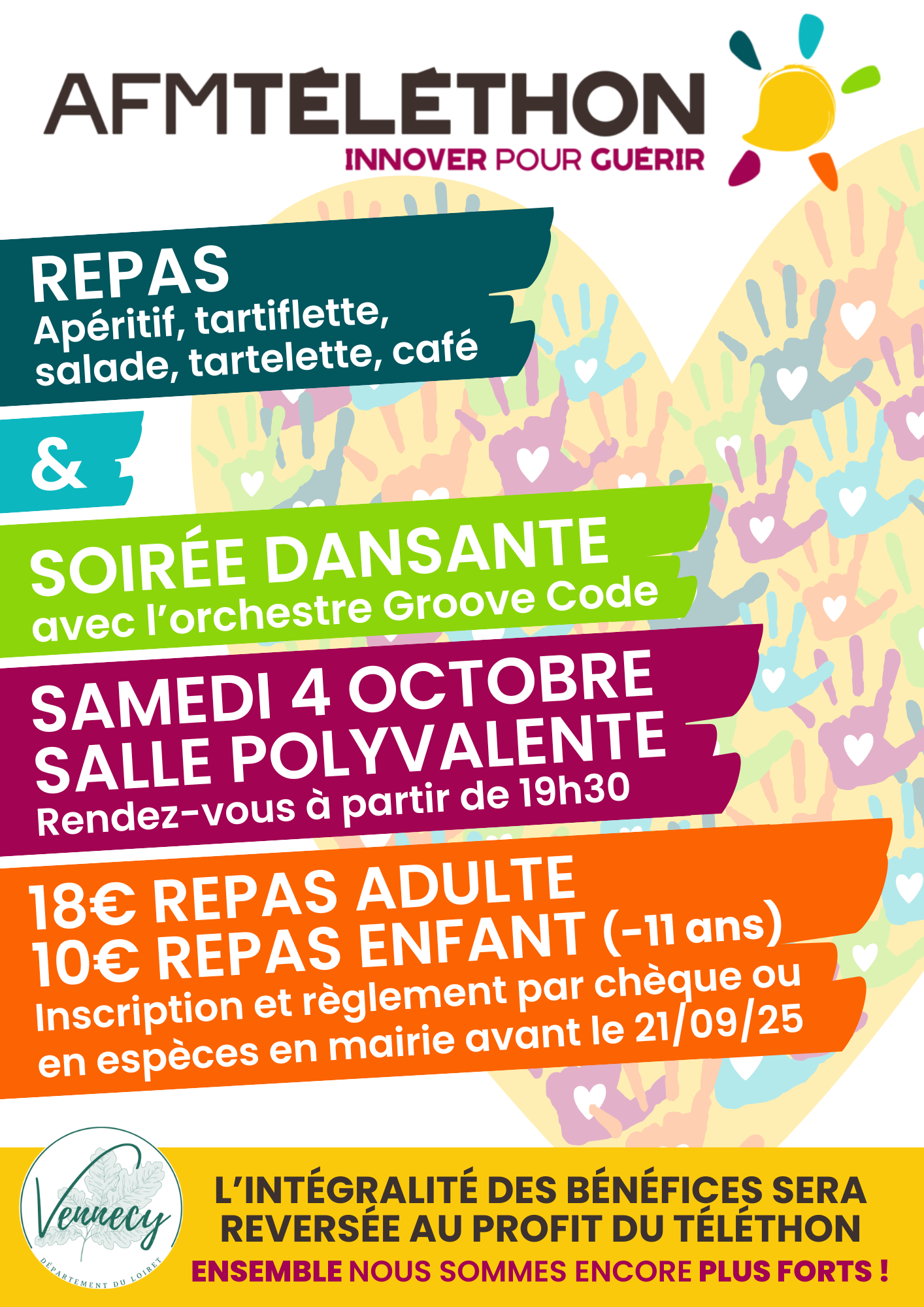 Vous trouverez toutes les informations sur la page suivante : https://www.vennecy.fr/actualites/repas-et-soiree-dansante-au-profit-du-telethon